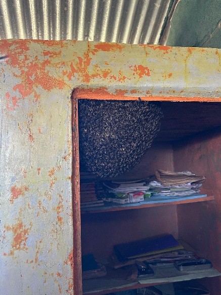 One problem encountered at the school was the bees’ nest that appeared over a weekend in the Resources cupboard in PP1. This necessitated closing that classroom until the nest was relocated well away from the school – not an issue often encountered in schools in the UK!